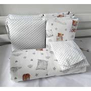 • комплекты в детскую кроватку, их надо выбирать исходя из формы и размеров спального места малыша. Сюда может входить не только подушечка и одеяло, но и бортики, балдахин, всевозможные элементы декора. Кроватка новорожденного – это то место, где крохе должно быть тепло, уютно и, конечно, безопасно, поэтому к выбору комплектов надо подходить ответственно.