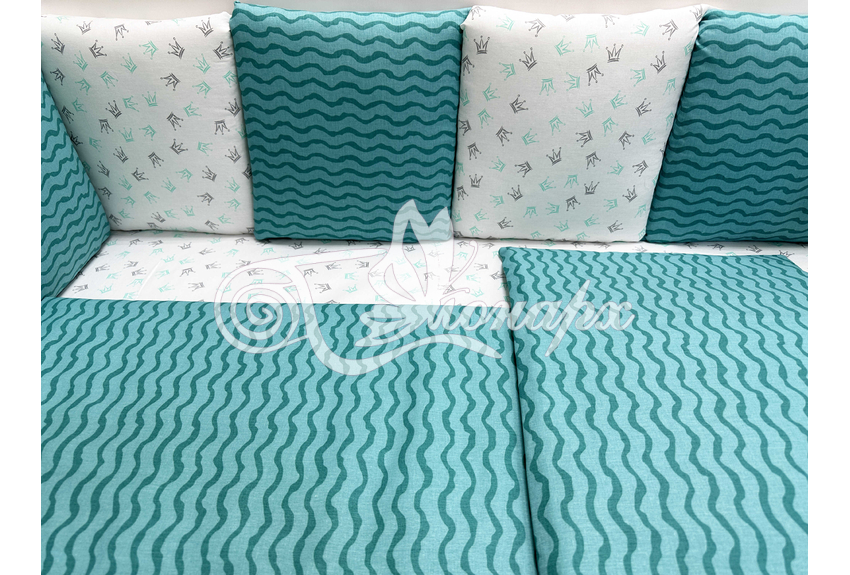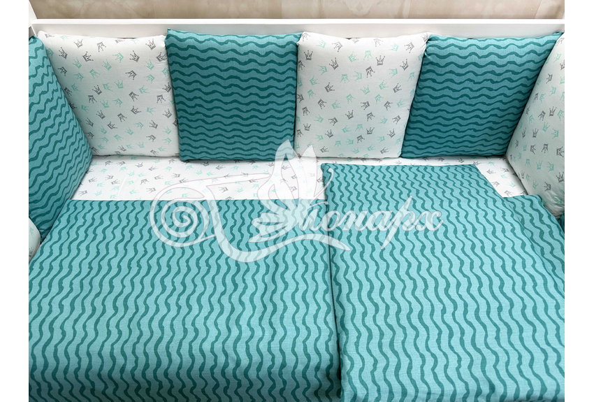 Бортик составной: 12 подушек 31х34 см на замочках упакованы в сумку-переноску.