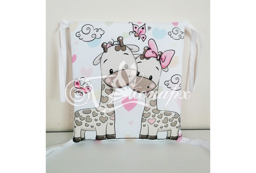 В наборе 4 плоских подушки на замочках для удобства стирки и с завязками для фиксации к кроватке.